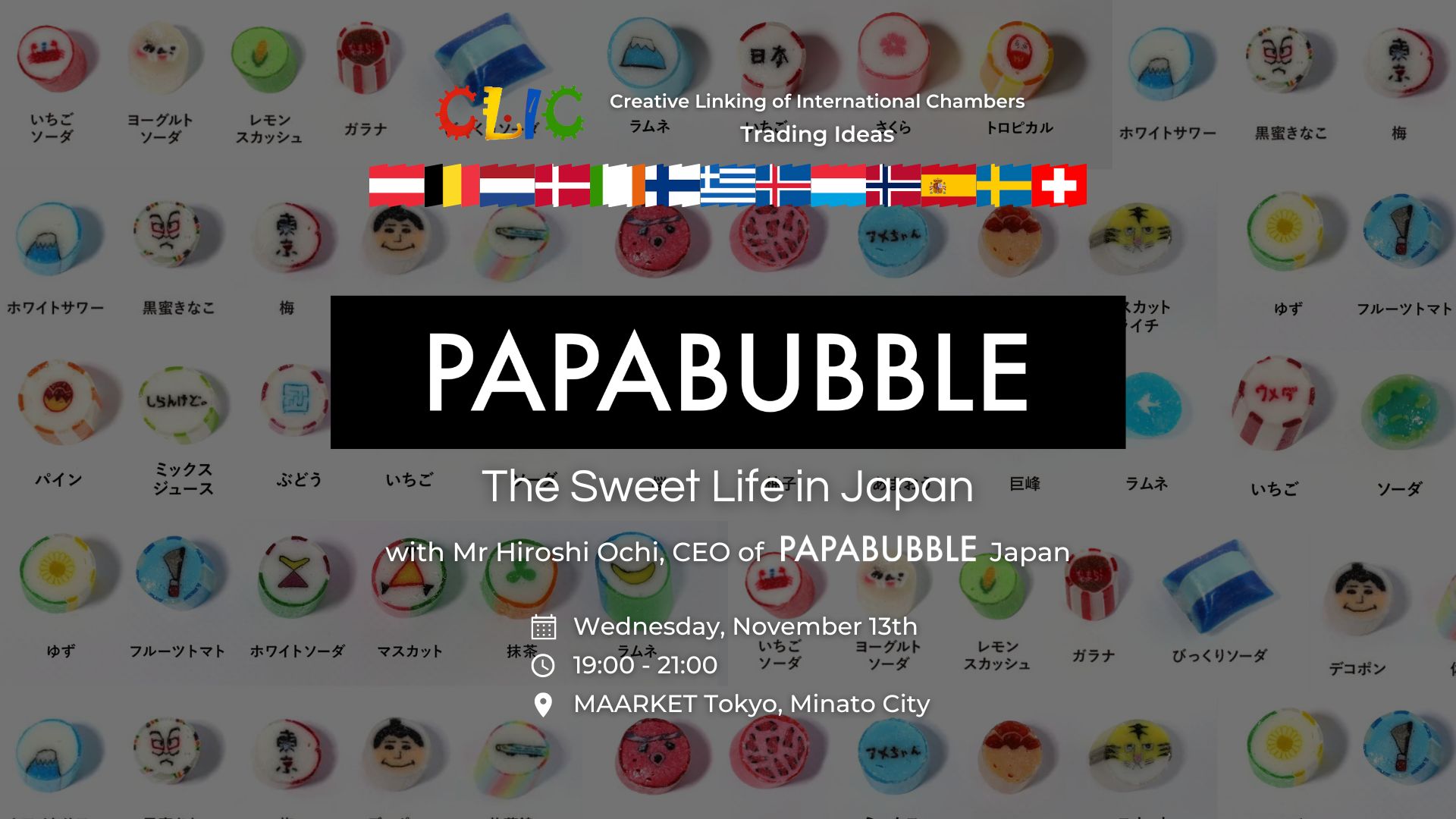 Join us on November 13th for another “CLIC” event, a loose organization of 12 smaller European Chambers of Commerce in Japan (Austrian, Belgian-Luxembourg, Danish, Dutch, Finnish, Greek, Icelandic, Irish, Norwegian, Spanish, Swedish and Swiss), and hear from Hiroshi Ochi, CEO of Papabubble Japan, about the company’s history of success in Japan.
