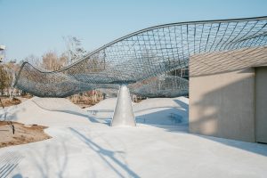 大阪万博(10月中旬まで開催)の休憩所4 、900㎡の公共スペースにおいて、BEAL InternationalのMORTEX®ブランドがさりげなく存在感を放っています。ここは静けさを求める訪問者が起伏のある風景と繊細な日陰の中で一息つける場所となっています。