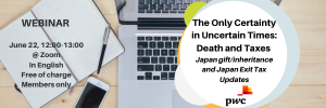 We gladly share here a summary of the webinar “The Only Certainty in Uncertain Times: Death and Taxes – Japan gift/inheritance and Japan Exit Tax Updates” we did with PwC on June 22.